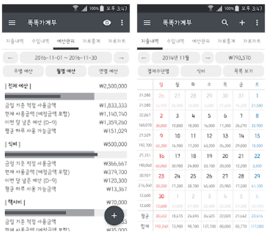 예산 관리를 통해 각 카테고리의 월별 지출, 수입, 저축액을 관리할 수 있습니다. 또한 스마트폰에서 설정할 수 있는 위젯 기능을 통해 데이터 표시, 투명도 및 테마 설정을 사용자 지정할 수 있습니다.