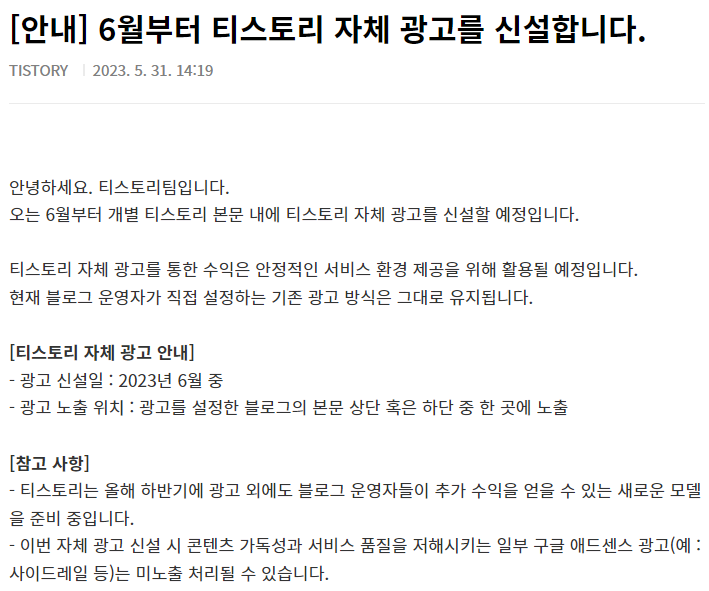 대표적으로 최근에 나온 티스토리 공지가 있습니다.