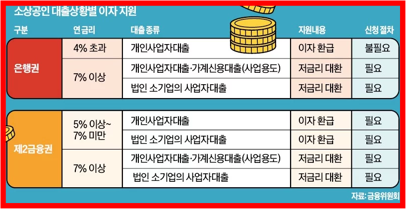 중소금융권 대출이자 환급 대상은 2023년 12월 31일 이전에 이자율이 5% 이상 7% 미만인 개인사업자, 법인 소기업은 대출을 받은 소상공인입니다. 중소금융권에는 저축은행, 상호금융, 카드사, 캐피탈 기관이 포함됩니다.