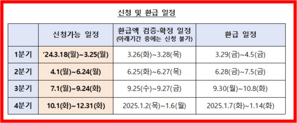 이자 환급 신청은 공식 홈페이지를 통해 이루어지며, 신청 기간과 환급 일정은 분기별로 정해져 있습니다. 예를 들어 2024년 1분기 신청 기간은 3월 18일부터 25일까지이며, 환급은 3월 29일부터 4월 5일 사이에 지급됩니다.