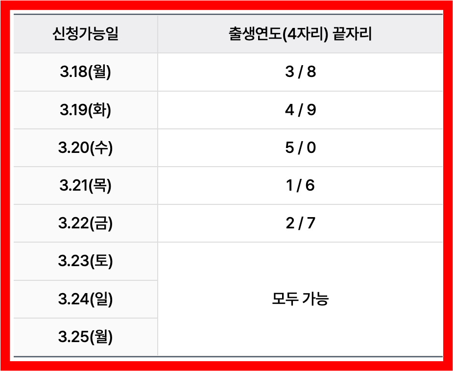출생연도 끝자리를 기준으로 5분기로 나뉘므로 본인에게 해당되는 날짜에 신청해야 합니다.