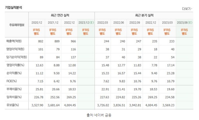 2022년 당기순이익 116억 원은 137억 원으로 3년 연속 흑자를 기록했습니다. 2023년 1분기 전년 동기 대비 매출은 4.5%, 영어 수익은 5.7%, 순이익은 44.9% 증가했습니다.