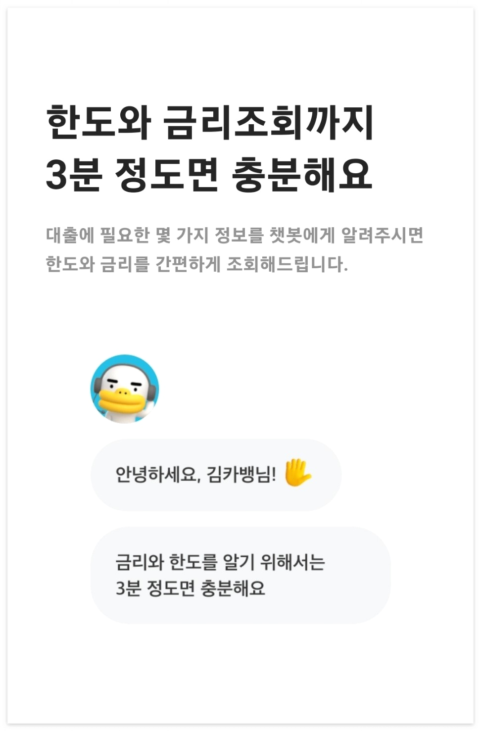 카카오뱅크 주택담보대출 페이지가 열리고 하단의 내 한도 확인하기 노란색 배너를 클릭하면 모든 과정이 비대면으로 편리하게 진행되며, 챗봇을 이용하면 더욱 쉽고 편리하게 신청할 수 있습니다.