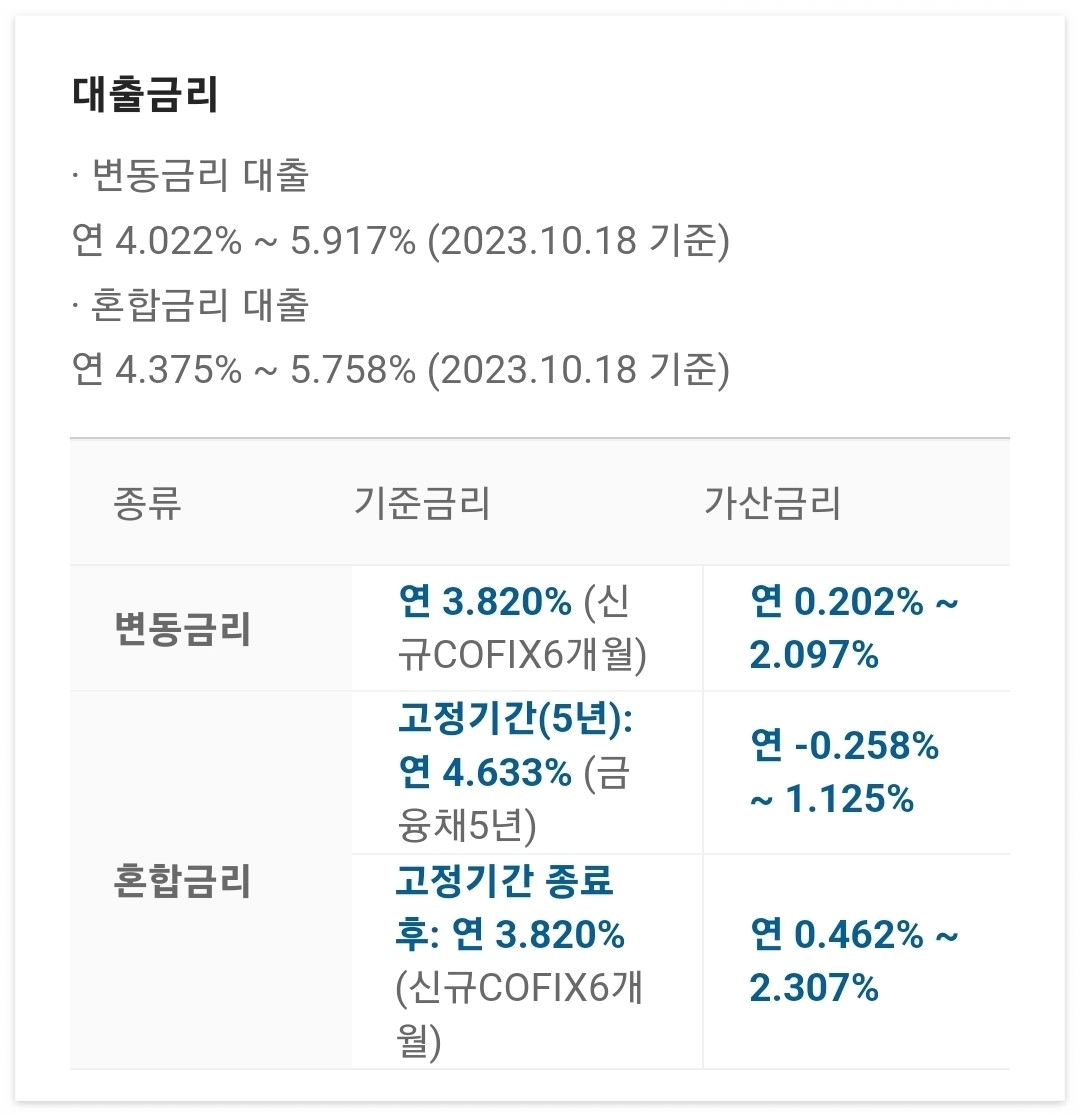카카오뱅크 주택담보대출의 금리는 변동금리 대출의 경우 연 4.022%~5.917%('18년 10월 23일 기준), 혼합금리 대출은 연 4.375%~5.758%('18년 10월 23일 기준)입니다.