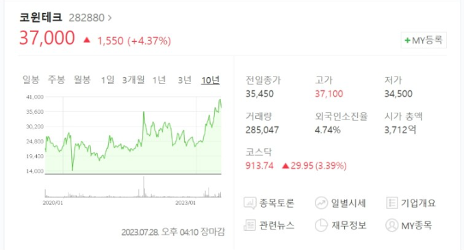 2차 전지의 노칭 장비를 공급하고 자동차 장비뿐만 아니라 공정 장비 등 다양한 사업을 수행하는 기업입니다. 시가총액 3,700억 원, 외국인 소진율 약 4%의 코스닥 상장주식이며 해당 종목은 2023년 이후 크게 상승하였고 이후 조정이 진행되고 있습니다. 매출과 영업이익 측면에서도 2022년부터 큰 폭의 증가세를 볼 수 있고 주당 배당금도 마찬가지입니다.